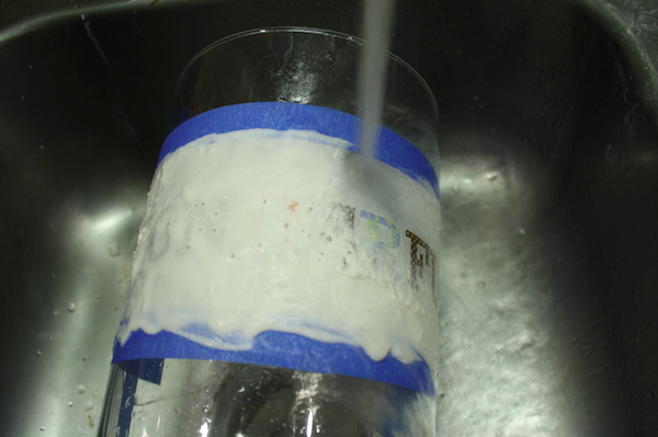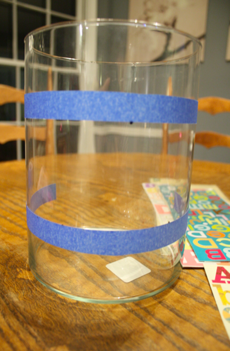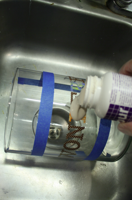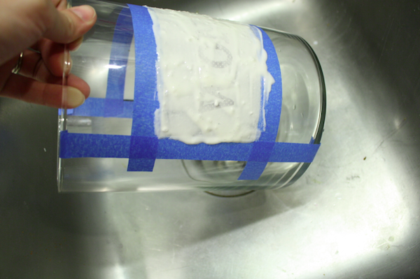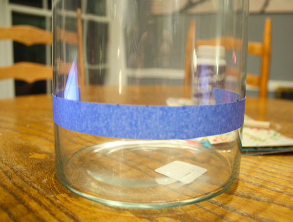 First I measured in 2.5″ from the bottom of the jar and made several marks with the dry erase marker. It comes off with the tape, actually, but also rubs off with your finger, so it’s perfect for marking on glass surfaces. I placed a piece of tape along my marks.