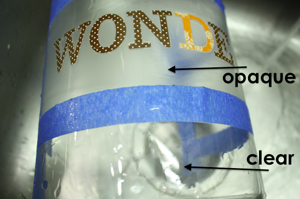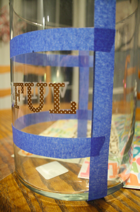 Using the stickers, I spelled out WONDERFUL across the middle of the empty section. I didn’t measure, I just eyeballed it on there. I have a ton of letter stickers and I usually pick them up when I see them on clearance at craft stores so I have them on hand for times like these. Make sure you press your stickers on firmly and entirely. Anywhere they’re not securely stuck to the jar will allow etching cream to seem under them and leave less-that-stellar lines.