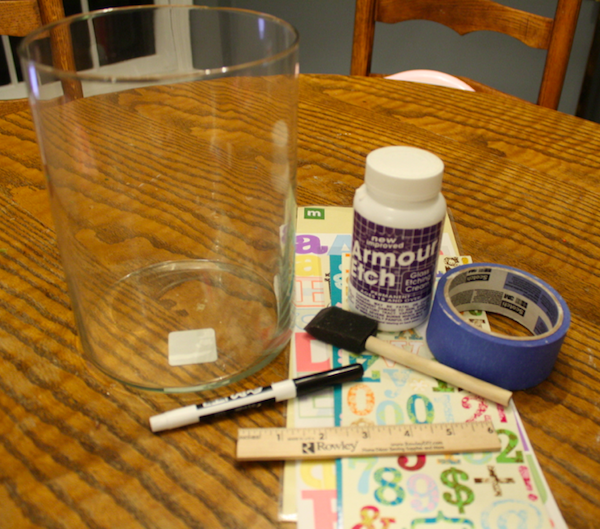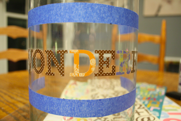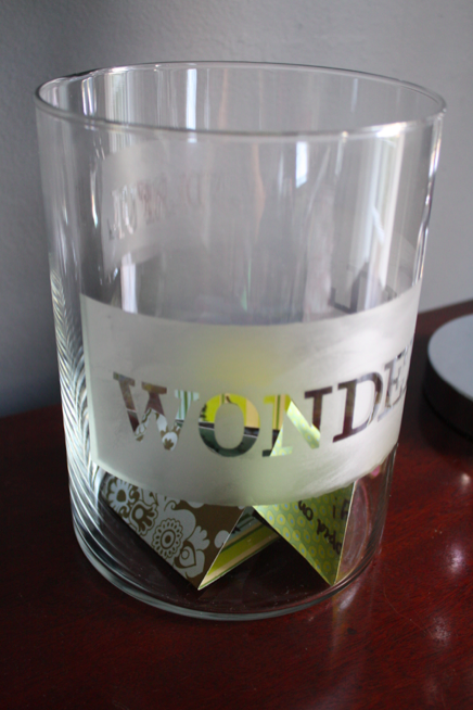 Then simply wipe away the letters and tape and throw them away and you’re done! This little project took me 30 minutes start to finish. While the jar etched I roughly cut up some pretty scrapbook paper I had on hand to put in the jar, but any paper will work.