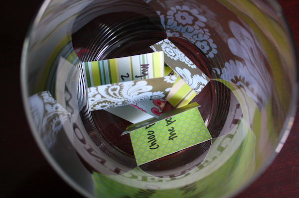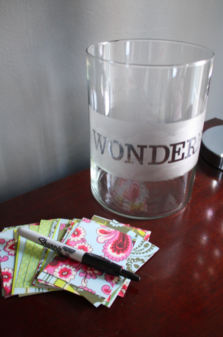 The Wonderful Jar is going to stay on the buffet in our dining room this whole year. Every time something wonderful happens to any of us, whether it’s monumental or a little thing that makes us smile, we’re going to write it on one of the pieces of paper and drop it into the jar. Over the course of the year we’ll be able to visually see all the amazing and wonderful things happening to our family and on December 31st this year, we’ll sit down together, dump out the jar, and focus on all the wonderful things that happened to us this year instead of grumbling about the negative. The girls are still really little and though I think Sofie will catch on quickly, I want this to be something we do year after year that they look forward to with anticipation and that it will help them to focus on the positive in their lives daily instead of being upset about the downfalls. I thought The Hubs might be a little hesitant, but he was pretty excited about the idea!
